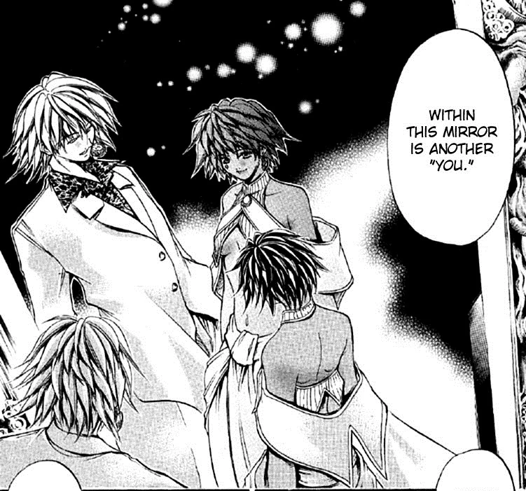 Hevn, but Akabane intervened. As the mirror had connected with Akabane's blood, Akabane decided to use his new ability to also create clones of his own to match Kagami's. Akabane then explained that by Kagami dividing himself into clones, he also divided his power. He stated that although the mirrors were real bodies, they couldn't possess 100% of his real strength. Each subsequent reflection in opposing mirrors were weaker than the one before - a copy of a copy. All of the Akabane's stabbed Kagami, stating that no mirror could possess 100% reflectivity. However, it was revealed that the real Kagami was not there.
